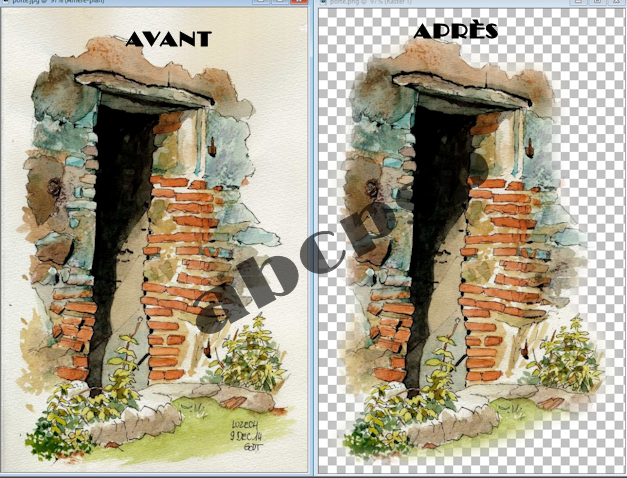 4---Dans la palette des calques on se place sur le calque de la Porte et on gomme la partie qui dépasse vers la droite de la bordure. On a une belle finition bien propre sur le côté droit de la porte.