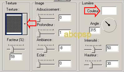 Mettre du BLANC dans la case Couleur du tableau. Il suffit de cliquer sur le rectangle blanc pour changer la teinte si nécessaire. Bien mettre les mêmes mesures et la bonne texture en cliquant sur la mini-flèche pour faire le choix de la bonne texture. Bien mettre -8 dans Ambiance.