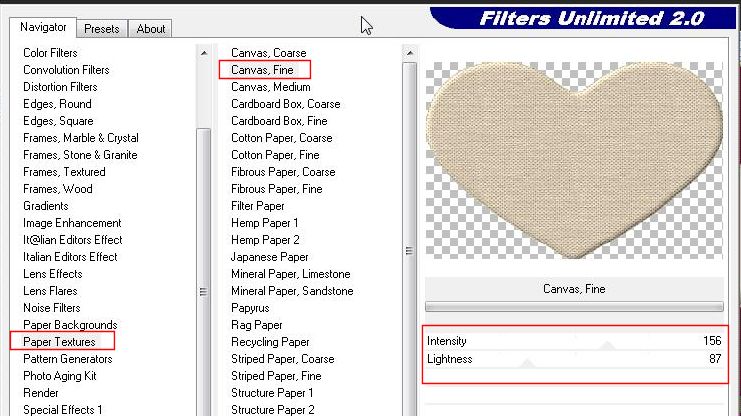 Votre coeur est toujours sélectionné. 6---Effets / Modules externes /I.C.N.E.T Filter Unlimited/ Paper Textures/ Canvas fine / 156 et 87