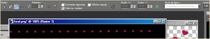 21---Mettre la couleur rouge b71440 dans votre avan-plan 22---Calques/ Nouveau calque raster 23---Avec l'outil Stylo, tracez une ligne pointillée , taille 7, forme, losange, de la gauche vers la droite. Laissez un peu d'espace à droite pour placer un coeur. Pour avoir une ligne bien droite, garder la touche MAJ appuyé en même temps que vous tracez la ligne.