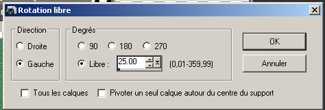 Alors vous avez effacé une partie de feuille.... 18---Activez votre tube aiguille /Edition/Copier. 19---Vous rendre sur vos feuilles et faire Edition/Coller comme un nouveau calque. Donnez un angle à votre aiguille en faisant IMAGE/ROTATION libre en mettant ces mesures. Déplacez ensuite avec l'outil déplacement, sur la feuille découpée.
